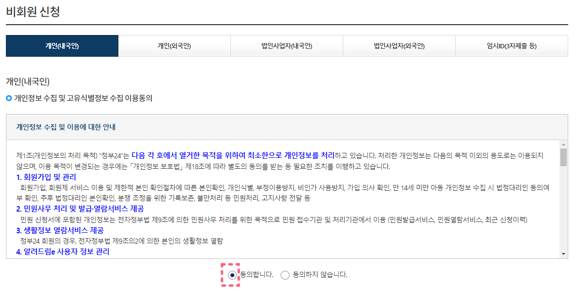 회원 또는 비회원(공동인증서 또는 간편인증 필요) 신청을 클릭합니다.